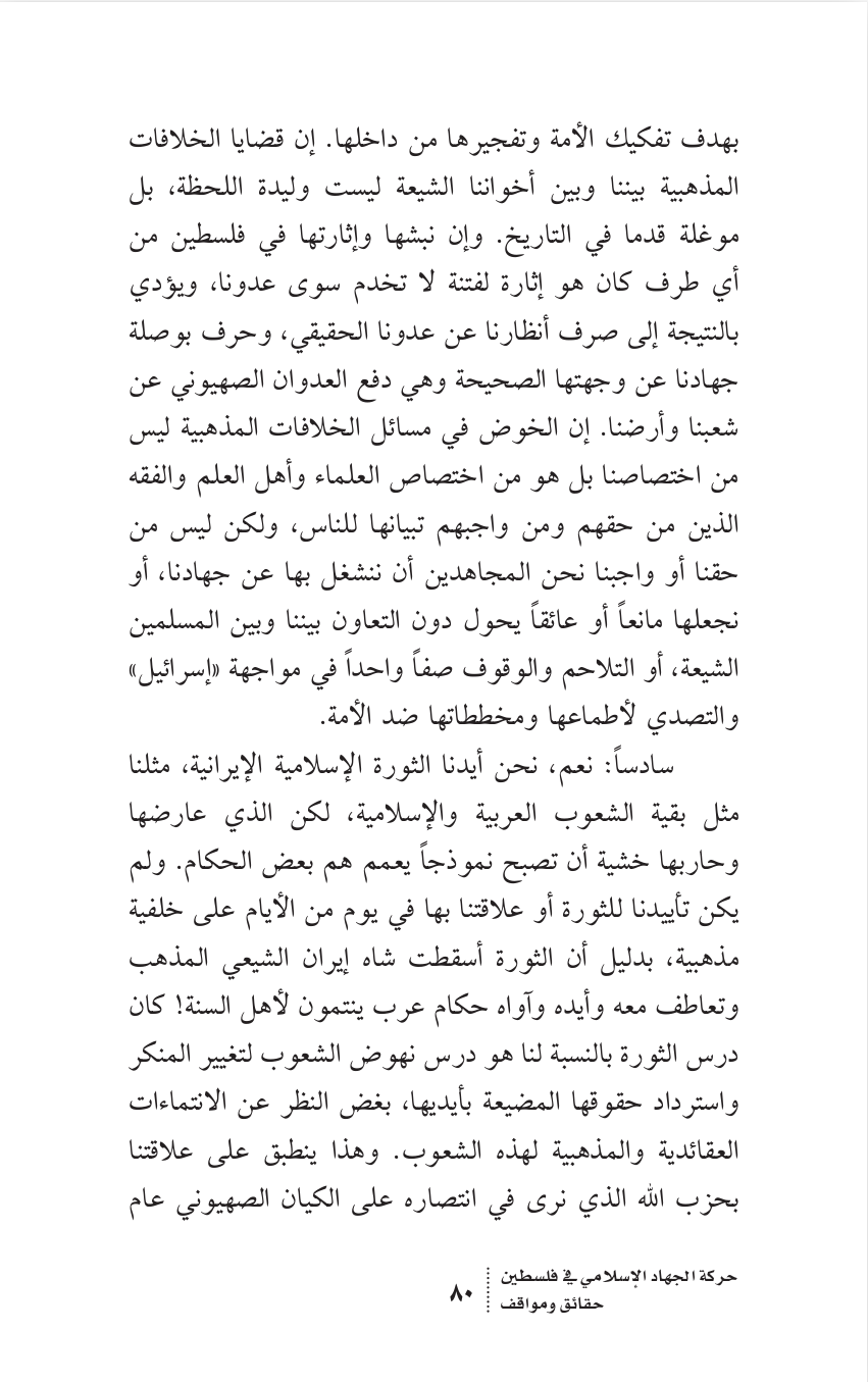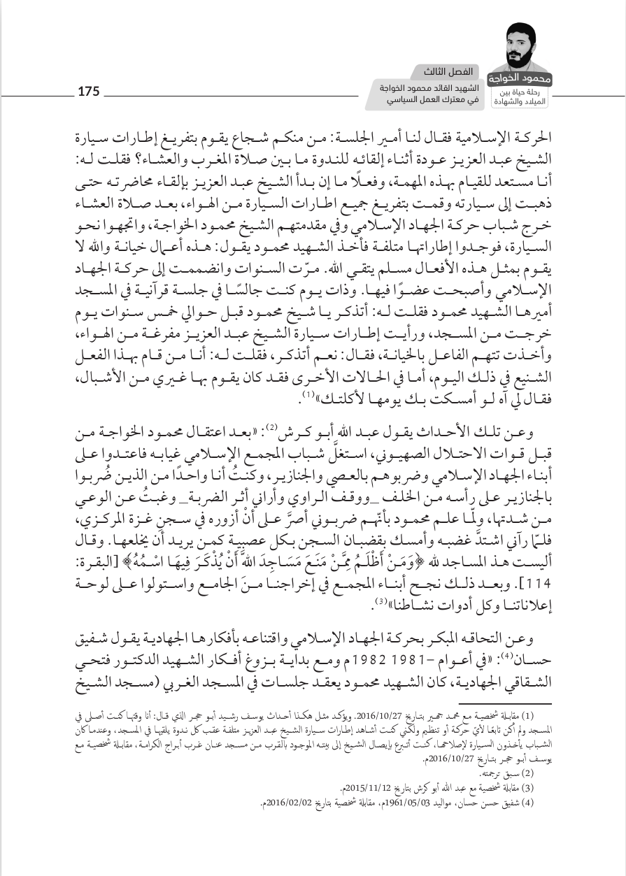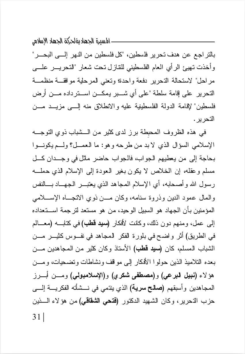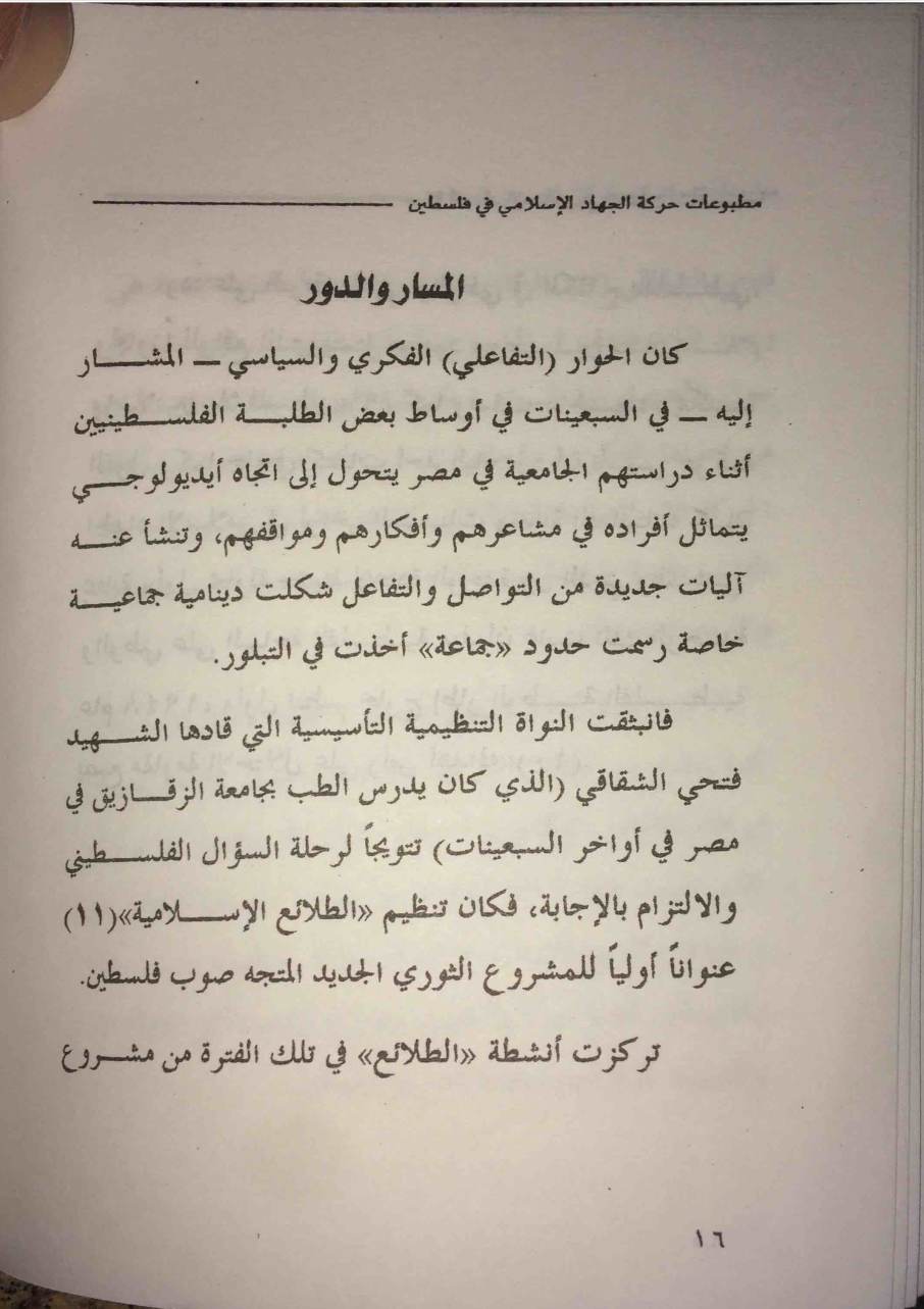 - Loren D. Lybarger, Identity and Religion in Palestine: The Struggle Between Islamism and Secularism in the Occupied Territories (Princeton, NJ: Princeton University Press, 2007), 17–18; Fathi al-Shiqaqi, 'al-Qadiya al-Filastiniyya: Hiya al-qadiya al-markaziyya li-l-haraka al-islamiyya . . . limadha?', in Ahmad, Rihlat al-damm alladhi hazam al-Sayf, 65. Correct reference for this footnote is Fathi al-Shiqaqi, "al-Tarikh limadha..?" al-Talia al-Islamiyya 11 (1983): 65-66.