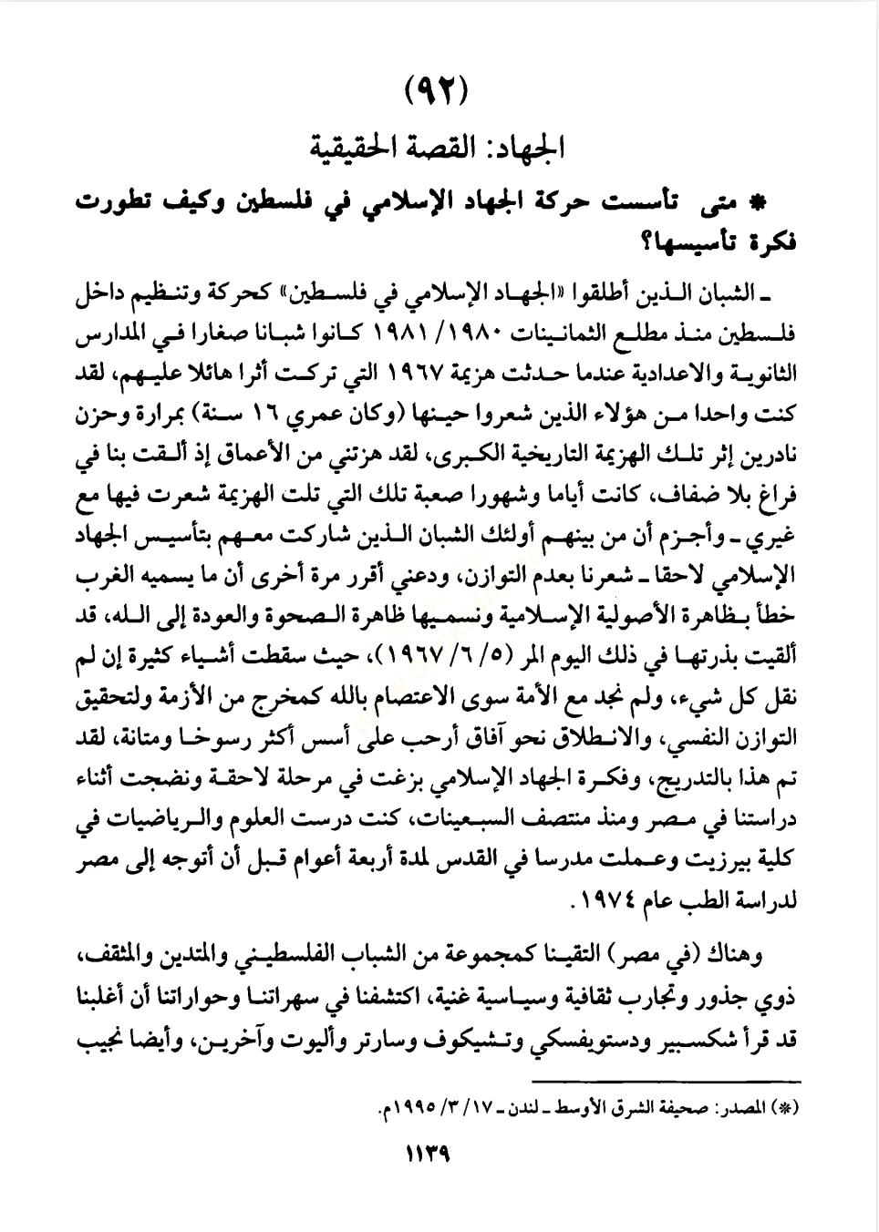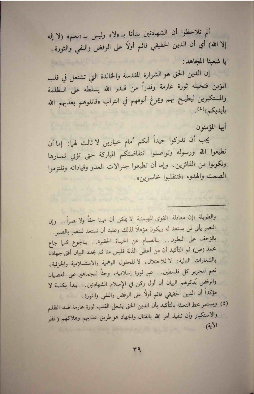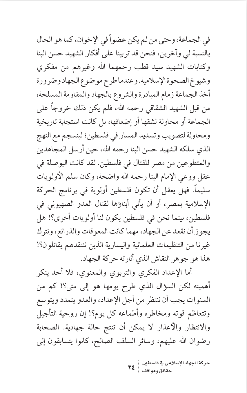 - Loren D. Lybarger, Identity and Religion in Palestine: The Struggle Between Islamism and Secularism in the Occupied Territories (Princeton, NJ: Princeton University Press, 2007), 17–18; Fathi al-Shiqaqi, 'al-Qadiya al-Filastiniyya: Hiya al-qadiya al-markaziyya li-l-haraka al-islamiyya . . . limadha?', in Ahmad, Rihlat al-damm alladhi hazam al-Sayf, 65. Correct reference for this footnote is Fathi al-Shiqaqi, "al-Tarikh limadha..?" al-Talia al-Islamiyya 11 (1983): 65-66.